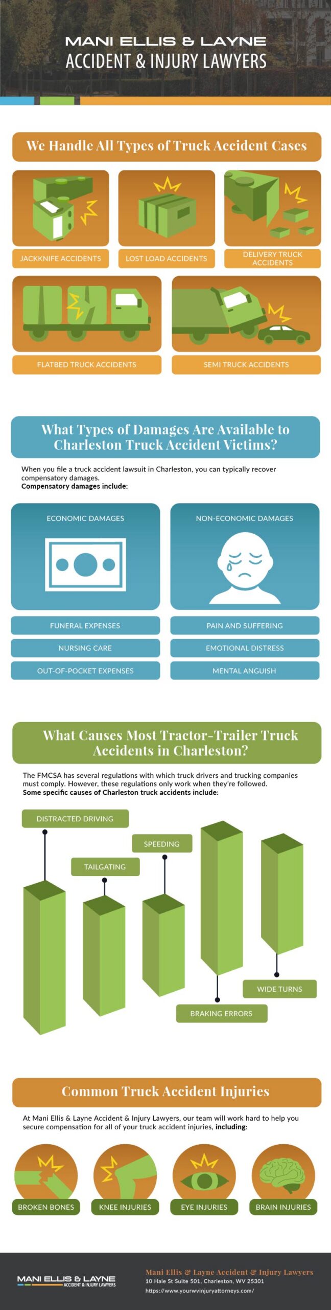 Were you injured in an accident involving a tractor-trailer, 18-wheeler, or another large commercial truck in Charleston, West Virginia? Don’t hesitate to reach out to the award-winning legal team at Mani Ellis & Layne Accident & Injury Lawyers at (304) 720-1000.